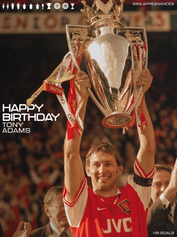 阿森纳官方制作海报为亚当斯庆祝59岁生日,同时配文:他是英格兰足球历史上唯一一位在三个不同年代(上世纪80年代、90年代以及本世纪00年代)举起三次联赛冠军的队长。祝你生日快乐,阿森纳先生。